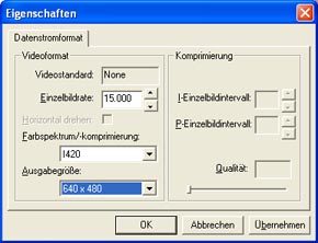 Hat man alles angeschlossen, startet man die Webcamsoftware. Dabei muss man vorher die Bildgröße und die Einzelbildrate einstellen. Die Bildgröße stellt man am besten auf 640x480 und die Bildrate auf ca. 15. Je kleiner die Bildrate, desto besser ist die Bildqualität aber die Aufnahmedauer verlängert sich entsprechend.