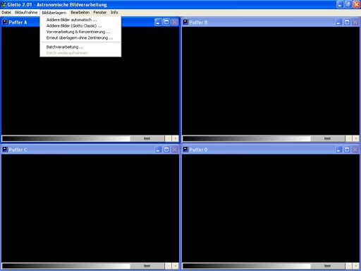Hat man nun endlich das Video aufgenommen, muss man die besten Einzelfotos aussortieren und mitteln. Durch das Mitteln werden mehr Details sichtbar und das Rauschen wird auch deutlich verringert. Aus tausenden Fotos die besten manuell zu ermitteln wäre natürlich viel zu zeitaufwendig. Dafür gibt es natürlich spezielle und kostenlose Software wie zum Beispiel "Giotto" oder "Registax" (siehe Links). Am Beispiel von Giotto möchte ich kurz die Vorgehensweise erklären.