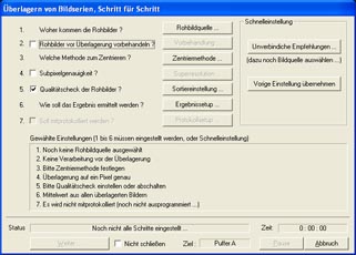Ist Giotto geöffnet, wählt man "Addiere Bilder automatisch..." im Menü "Bildüberlagern". Im nächsten Fenster gibt es sehr viele Einstellmöglichkeiten. Für Anfänger empfehle ich die "Schnelleinstellung". Dort wählt man den Button "Planeten". Zusätzlich muss man die "Rohbildquelle" auswählen. Wenn alles richtig eingestellt wurde, klickt man auf "Weiter". Je nach Menge der aufgenommenen Fotos und der Leistung des Computers kann das Bearbeiten einige Zeit in Anspruch nehmen. 15 bis 30 Minuten sind typisch bei mir. Wer mit einem Laptop arbeitet, sollte ihn unbedingt ans Netz anschließen. Dadurch wird die Bearbeitungszeit erheblich beschleunigt!