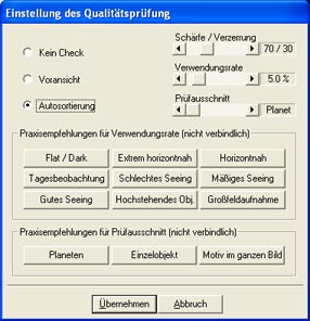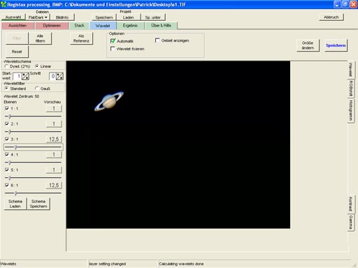 Da durch das Mitteln das Foto leicht unscharf wird, sollte man es etwas nachschärfen. Dabei sollte man aber nicht übertreiben, da es ansonsten unrealistisch wirkt! Das Schärfen geht mit vielen Programmen. Meiner Meinung nach ist aber Registax die beste Lösung. Öffnet man ein Foto in Registax erscheint folgendes Fenster: