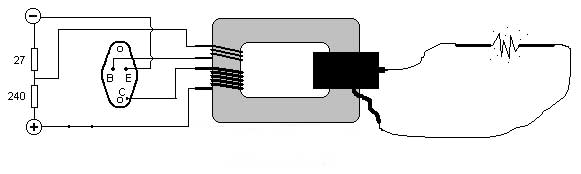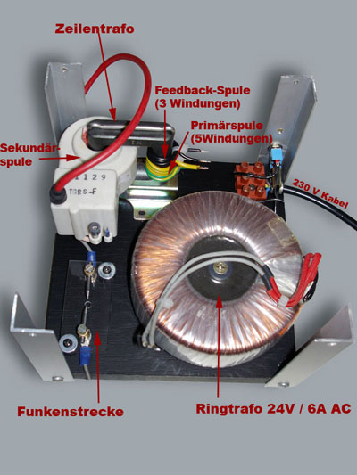 Als Hochspannungstrafo dient ein Zeilentrafo aus einem Fernseher. Damit aber solch ein Trafo eine Hochspannung erzeugt, ist eine spezielle Ansteuerung nötig (siehe Foto unten). Dazu wird zuerst die Primärspule abgerupft und zwei Drähte aufgewickelt. Die untere Wicklung besteht aus 5 Windungen eines ca. 1,6mm dicken Kupferlackdrahtes und die obere Wicklung besteht aus 3 Windungen eines ca. 1mm dicken Drahtes. Danach werden die Drähte, die 5 Watt Widerstände und der Hochleistungstransistor (2N3005) gemäß des Schaltplanes verlötet. Der Transistor braucht wegen der großen Wärmeentwicklung einen dicken Kühlkörper.