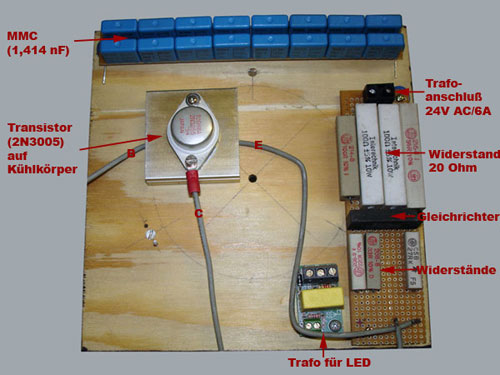 Die Versorgungsspannung beträgt ca. 12 V / 2A DC. Da ich aber ein Ringtrafo mit 24V / 6A AC hatte, musste ich noch vor die Schaltung einige Widerstände (20 Ohm) und ein Gleichrichter einbauen (siehe unterers rechtes Foto).