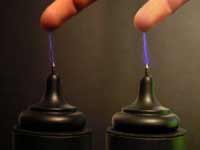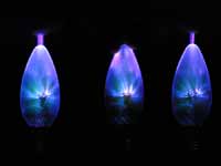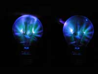 Setzt man eine normale Glühbirne auf die spitzte der Teslaspule, so enstehen sehr feine Blitzte in der Birne. Dabei wird das Gas in den Glühbirnen ionisiert und es beginnt zu leuchten (Plasma). Berührt man die Glühbirne, so werden die Blitzt an der Hand konzentriert. Es entstehen dadurch faszinierende Leuchteffekte!!!