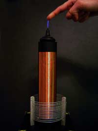 Um eine hohe Schwingungsenergie zu erreichen, muss bereits eine hohe Eingangsspannung vorhanden sein. Berührt man jetzt das obere Ende der Teslaspule, so fließen einige tausend Volt durch den Körper. Man spürt nur deshalb davon nichts, da die Spannung eine sehr hohe Frequenz hat. Wäre das Gleichstrom, so wäre die Spannung absolut tödlich!!!
